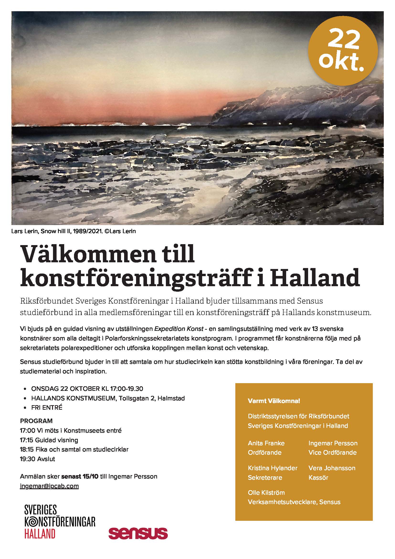 Riksförbundet Sveriges Konstföreningar i Halland bjuder tillsammans med Sensus studieförbund in alla medlemsföreningar till en konstföreningsträff på Hallands konstmuseum. 22 okt.